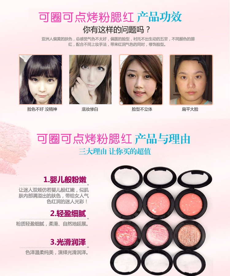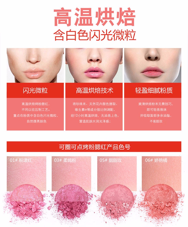 创新烤粉腮红,点亮肌肤红润光感。将深海极品珍珠粉末、有机花卉颜色、维生素E相揉和,置于高温环境下进行烘焙,蒸发多余水分制造出轻盈细腻的粉质。可圈可点烤粉腮红,如丝顺滑的触感,更加轻柔贴合肌肤,营造如陶瓷般光泽柔美的通透红晕。自然延展、自然吸附、自然防脱。犹如艺术品般的外形,透过透明盒盖,绚丽色彩跳跃于眼帘;深浅色泽的巧妙调和,轻盈如飘羽的细腻粉质,无论是以化妆刷或是指腹上妆,烘焙粉末都可吸附于肌肤表面,自然延展。