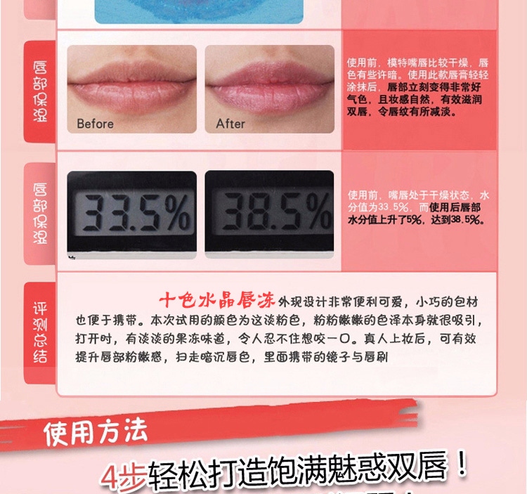 十色水晶唇冻ODM所含成份:维他命A衍生成份,使皮肤的骨原水平回复正常,帮助减少唇部周围的细纹,并使双唇丰润幼滑。