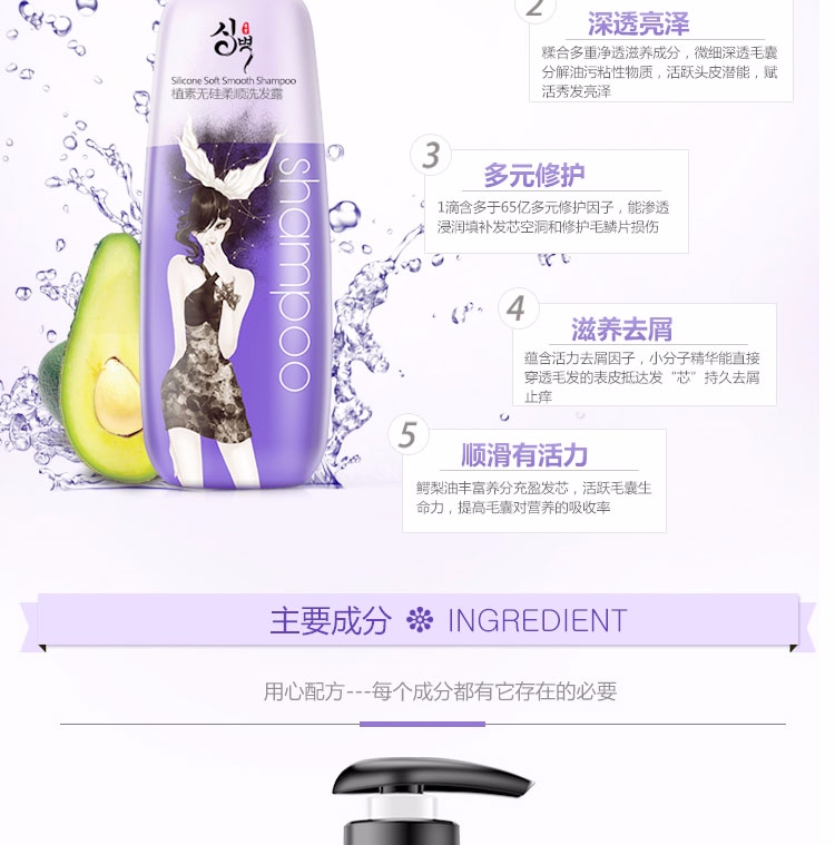 植素无硅柔顺洗发露不含硅以及低泡设计,清除头皮污垢,还头发素颜。汇集多种美容元素,渗入发丝纤维使发芯柔韧有弹性,补充秀发失去的保护膜,恢复现代女性发质的柔韧顺滑和炫亮光泽!滋养发丝,令秀发富有弹性。带有花香,清爽清新。